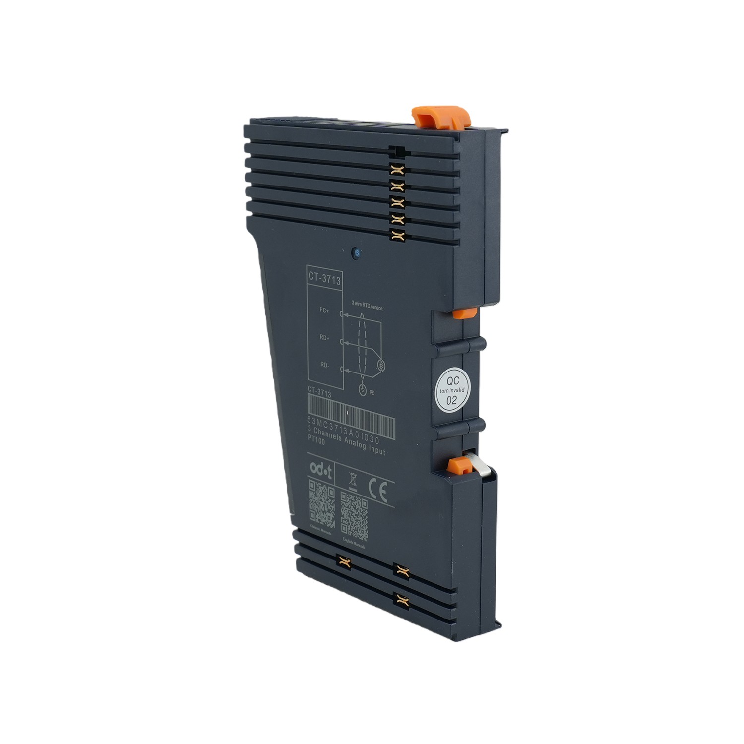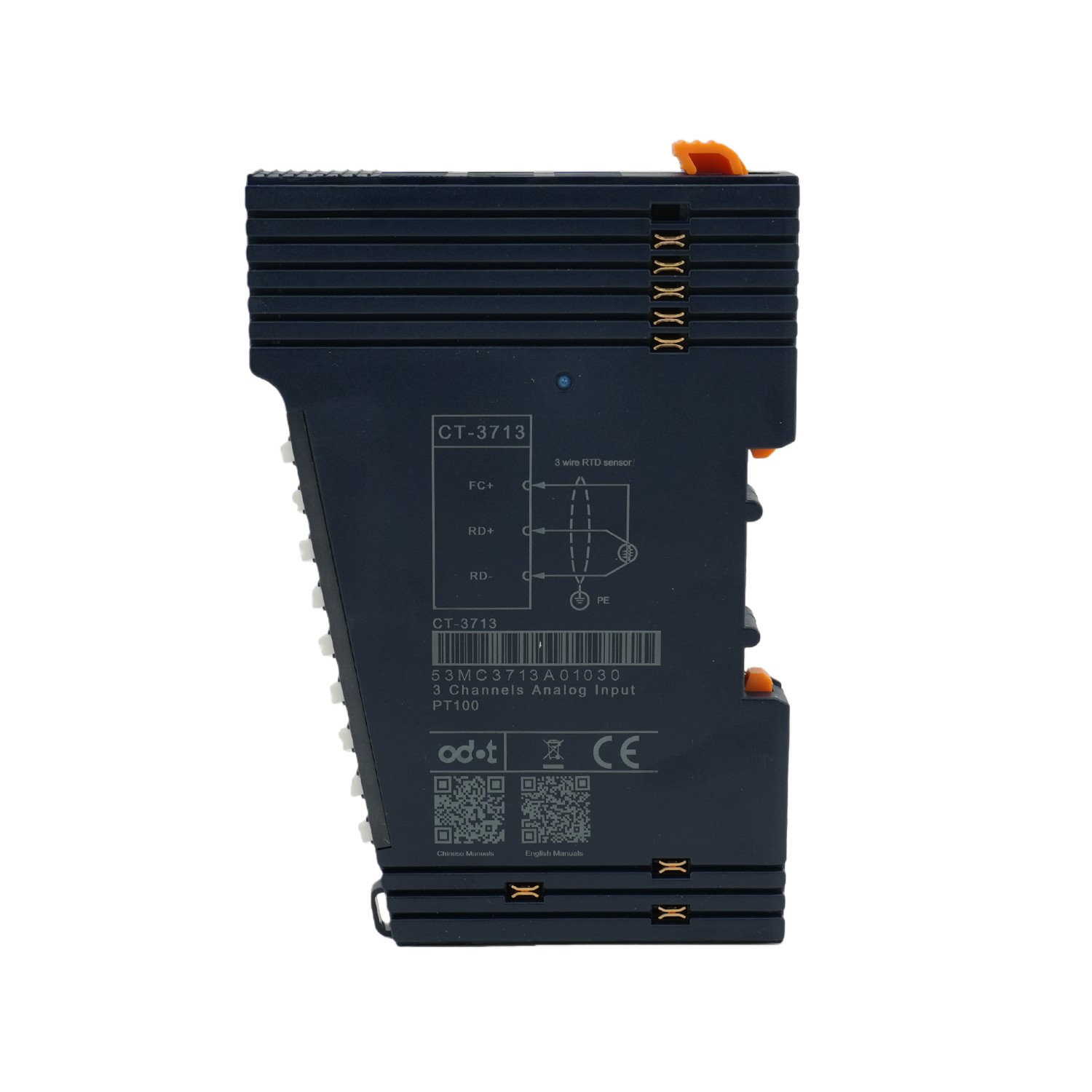 CT-3713 RTD Temperature Acquisition Module 3CH PT100 CT-3713: 3-channel RTD-PT100 temperature acquisition module Module features 1. The module supports 3-channel RTD thermal resistance (PT100) temperature acquisition 2. The module could be connected to a 2-wire or 3-wire PT100 temperature sensor 4. The internal bus of the module and field input adopts magnetic isolation 5. The module carries with 3 analog input channel LED indicator 6. 15-bit ADC resolution Technical Parameters Output Parameters Power Max.37mA @ 5.0Vdc Isolation I/O to internal bus: magnetic isolation (2.5KVrms) Field power Not used Wiring Max: AWG 18 Mounting Type 35 mm Din-Rail Size 115*14*75mm Weight 65g Environment Specification Operating Temperature of Vertical Installation -35℃~70℃ Operating Temperature of Horizontal Installation -35℃~60℃ Relative Humidity 5~ 95%RH (No Condensation) Storage Temperature -40℃~85℃ Storage Humidity 5~ 95%RH (No Condensation) Manufacturing Test Temperatu…