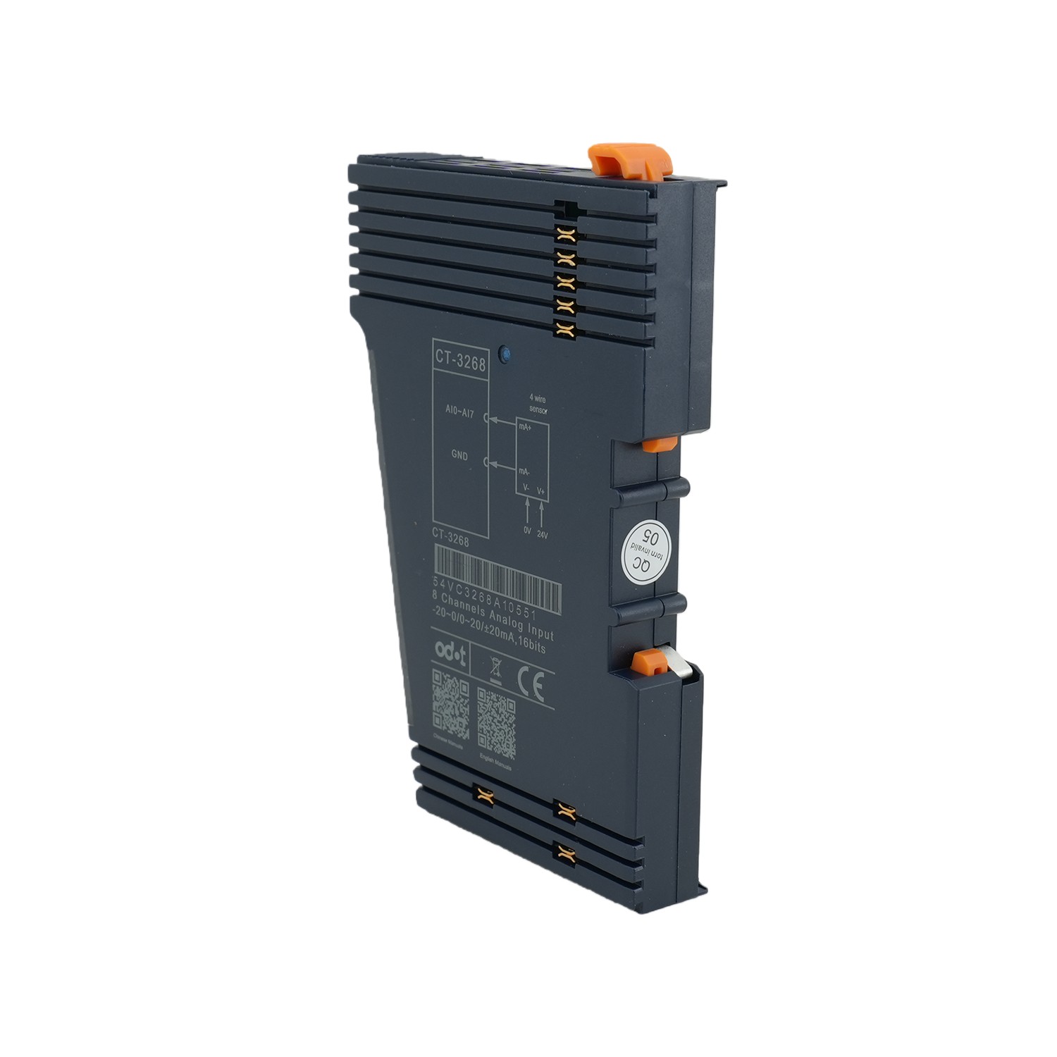 CT-3268 Current Analog Input Module 8AI The CT-3268 8-channel current analog input module by Sichuan Odot is a high-precision, bipolar acquisition solution engineered for advanced industrial measurement and control applications. It directly addresses global engineering challenges in bidirectional current signal handling, high-density I/O integration, and inadequate surge protection. Supporting 8 independent channels, the module can be configured for 0–20mA, –20–0mA, or ±20mA input ranges—enabling full-scale acquisition of bipolar sensor signals such as those from torque transducers, bidirectional flow meters, or position feedback devices. With 15-bit single-ended bipolar resolution, it accurately captures even subtle signal variations. The module accepts 2-wire active current-output sensors (requiring external loop power) and connects directly to standard industrial transmitters. Critical reliability features include magnetic insulation between the internal backplane bus and field inp…