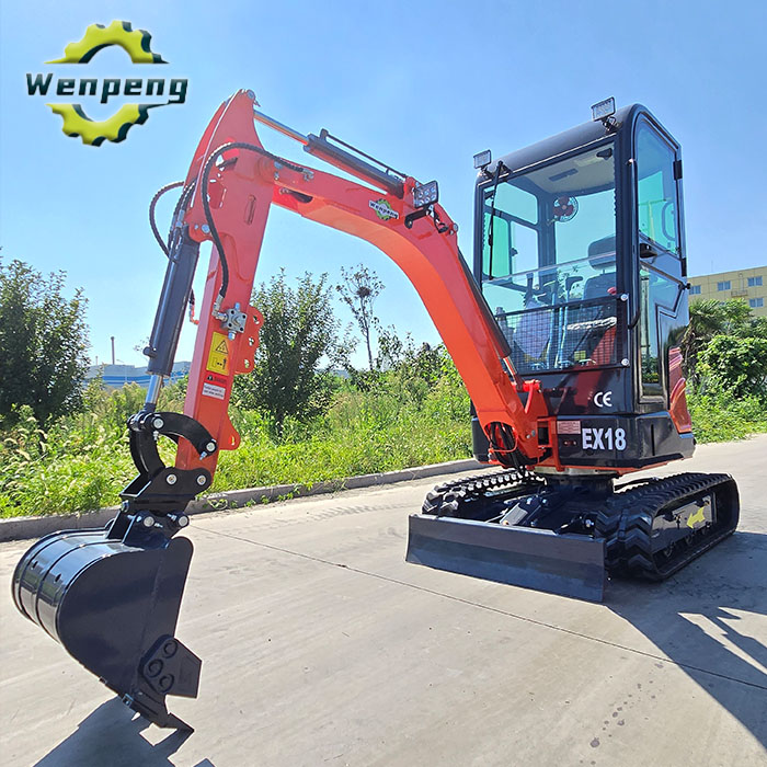 Wenpeng Machinery supplies high-quality 1.8 Ton mini crawler excavator, model EX-18, bucket capacity 0.04m³. Equipped with high-quality diesel engines and hydraulic drive systems, it is flexible to operate, powerful and durable. Our excavators are strictly quality controlled and meet CE standards, so you can buy them with confidence. Features 1. The mini crawler excavator adopts a tailless design with a compact body, which can act in narrow areas 2. The 360 degree rotating body, the boom has a wide operating range and is more flexible to operate 3. The 1.8-ton crawler mini excavator is equipped with a stable crawler chassis system, which makes walking more stable and has good passability 4. The Mini hydraulic excavator is equipped with a lifting bulldozer, and optional accessories can be selected as required, such as: mower, breaker, fork, bucket, grab hook, ripper, hydraulic thumb clamp, Sand bucket, etc., with strong versatility. Parameter Model:EX18 Technical Emission Sta…
